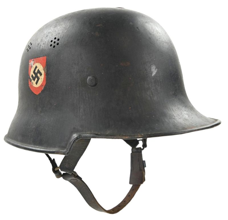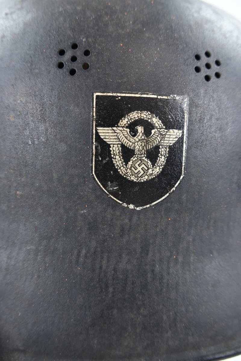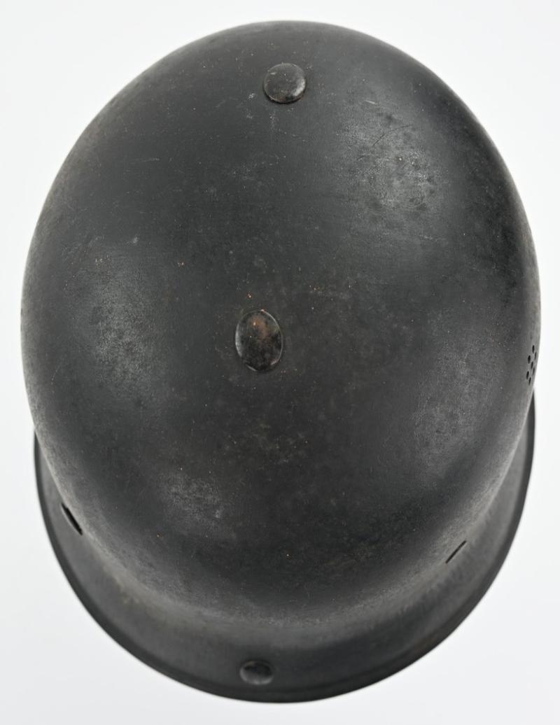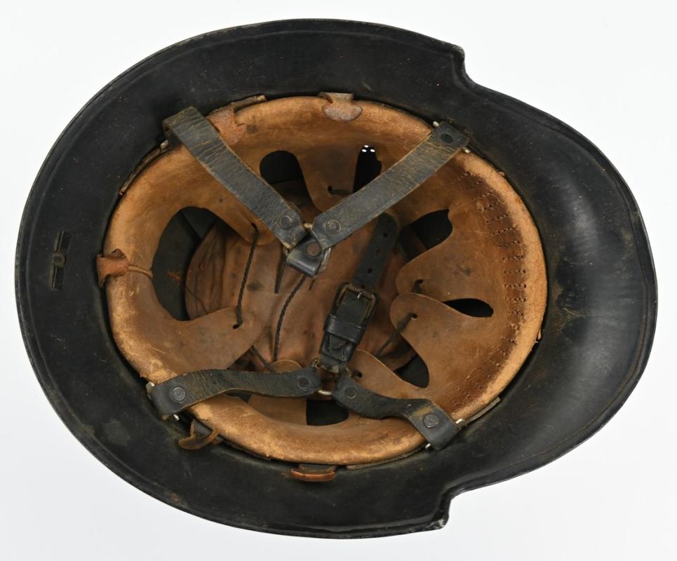 In a very good and stunning condition a German Double Deccal M34 Fire Police Helmet (Feuerschutzpolizei M34 Stahlhelm) constructed in steel with a crimped edge complete with original black paint on the interior and exterior.