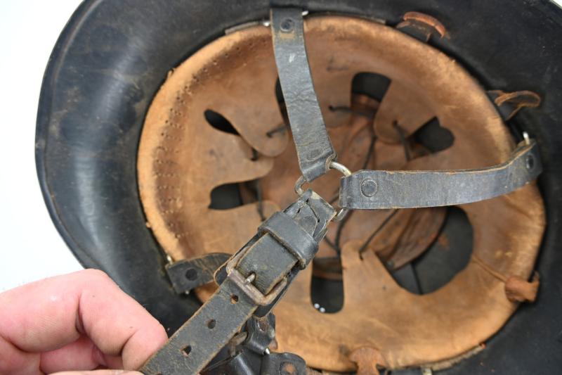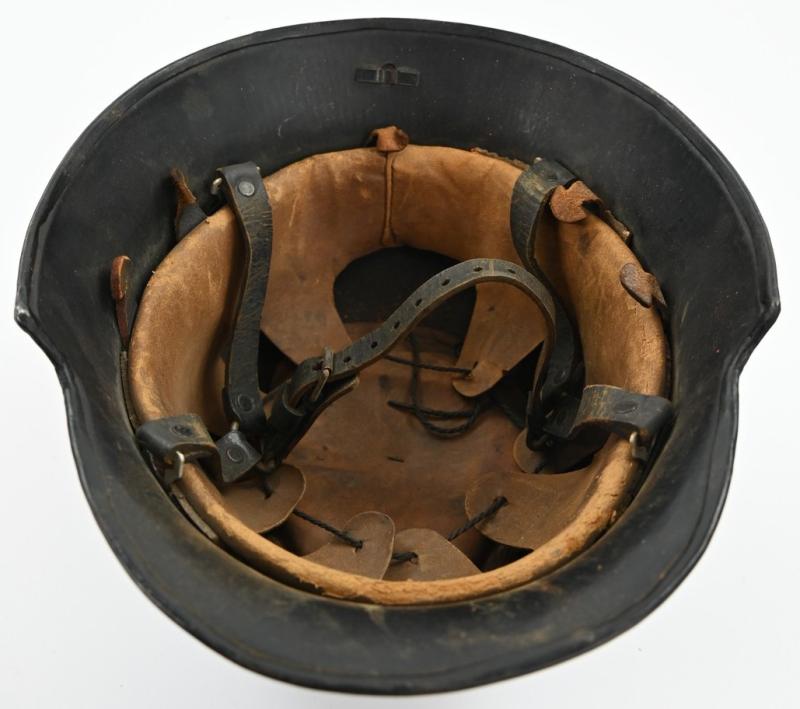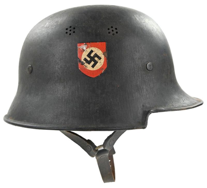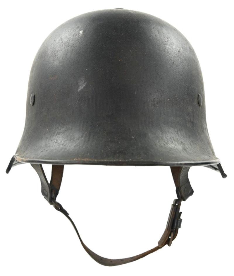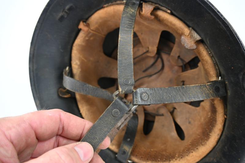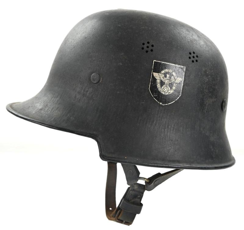 In a very good and stunning condition a German Double Deccal M34 Fire Police Helmet (Feuerschutzpolizei M34 Stahlhelm) constructed in steel with a crimped edge complete with original black paint on the interior and exterior.