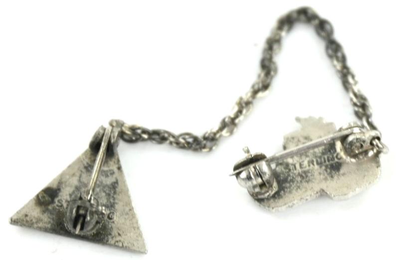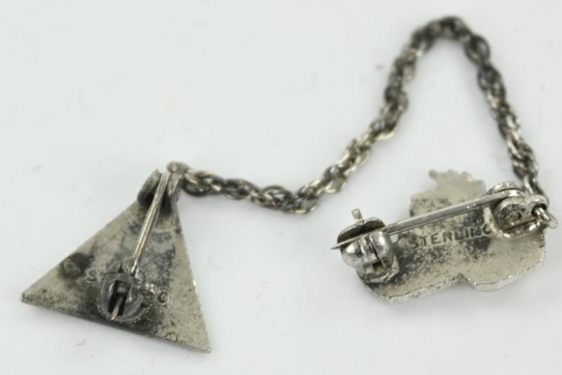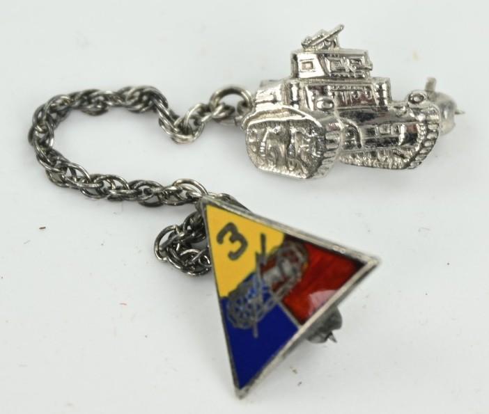 The sterling made and marked sweetheart comes with the triangle 3th Armored division patch in sterling silver and has a chained tank, also made and marked sterling silver, attached.