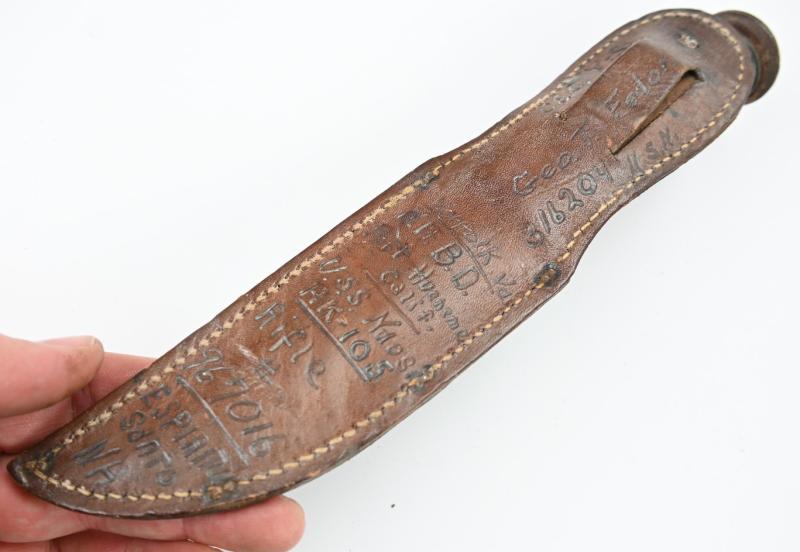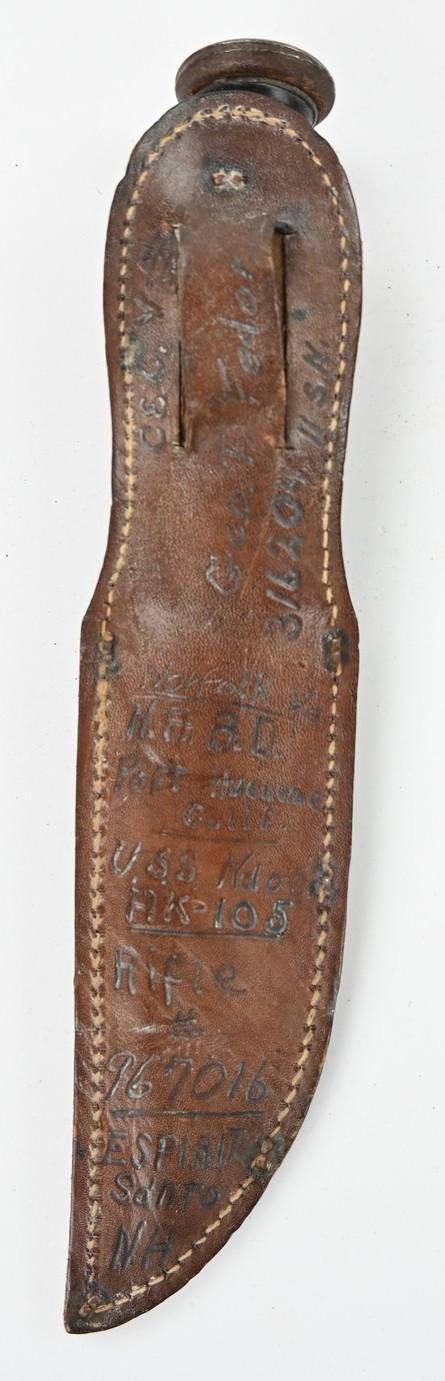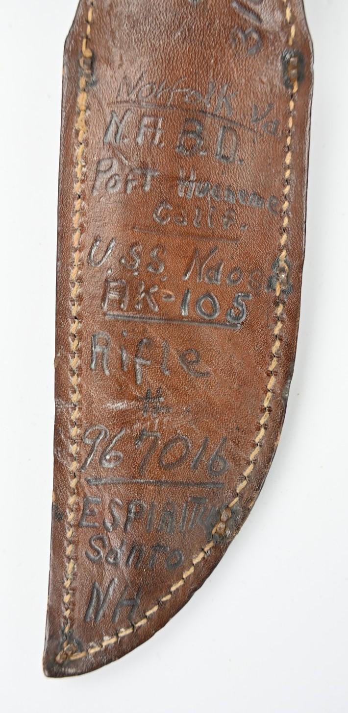 The knife comes with a complete marked leather scabbard on the name of USN member Geo T. Fedor, employee on the USS Naos AK-105.
