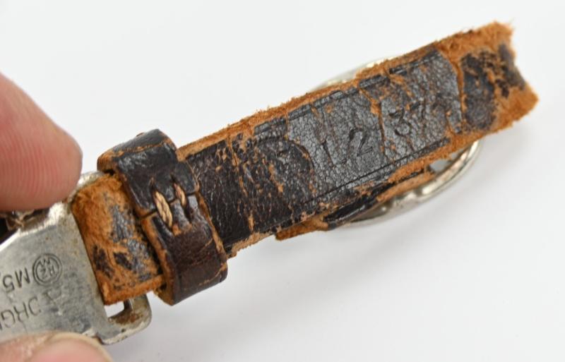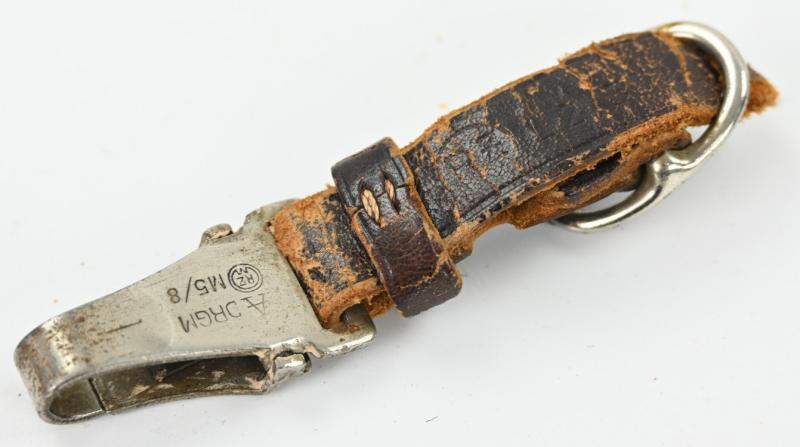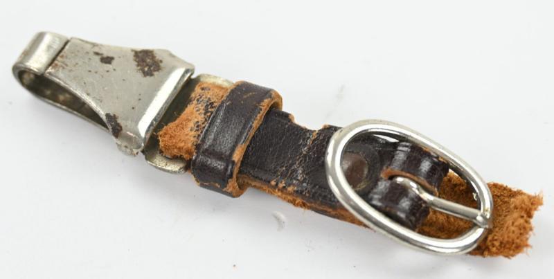 In a very nice condition a German SA Sturmabteilung Dagger Hanger. The hanger is nicely maker marked on the clip and inside the leather. Sadly the leather strap is damaged. Still a very nice example.
