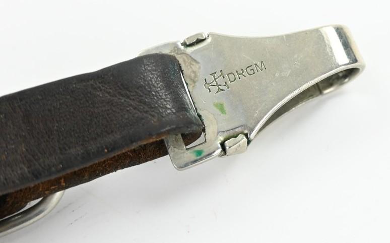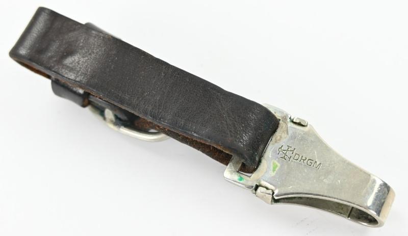 The hanger comes in brown leather and has maker marking on the nickle silver catch by Assmann.