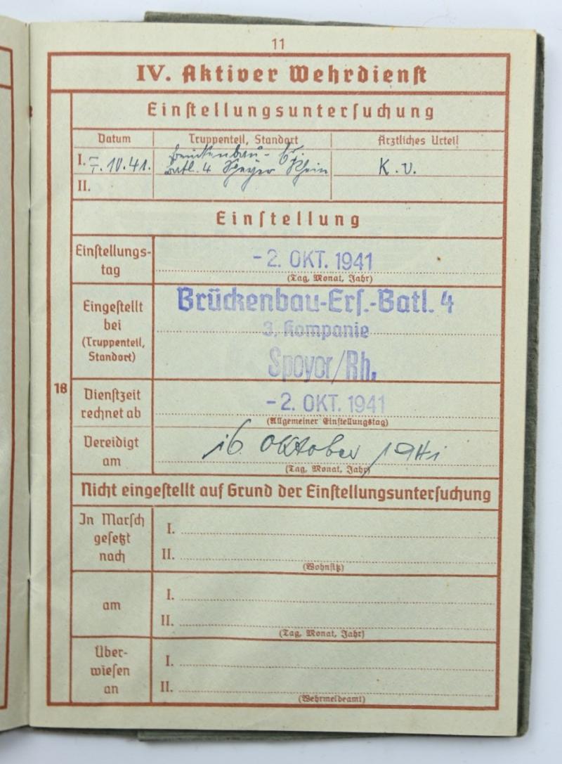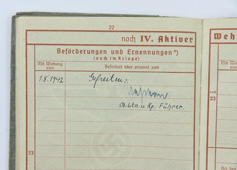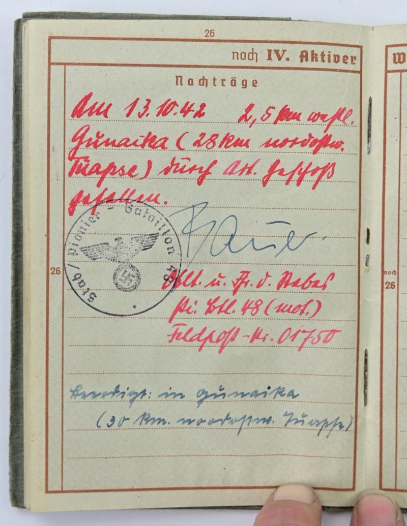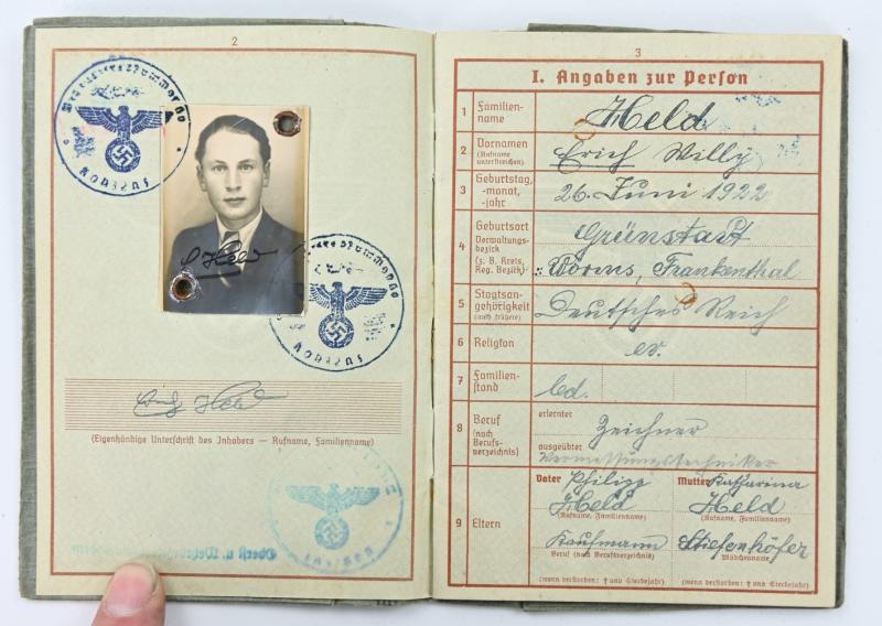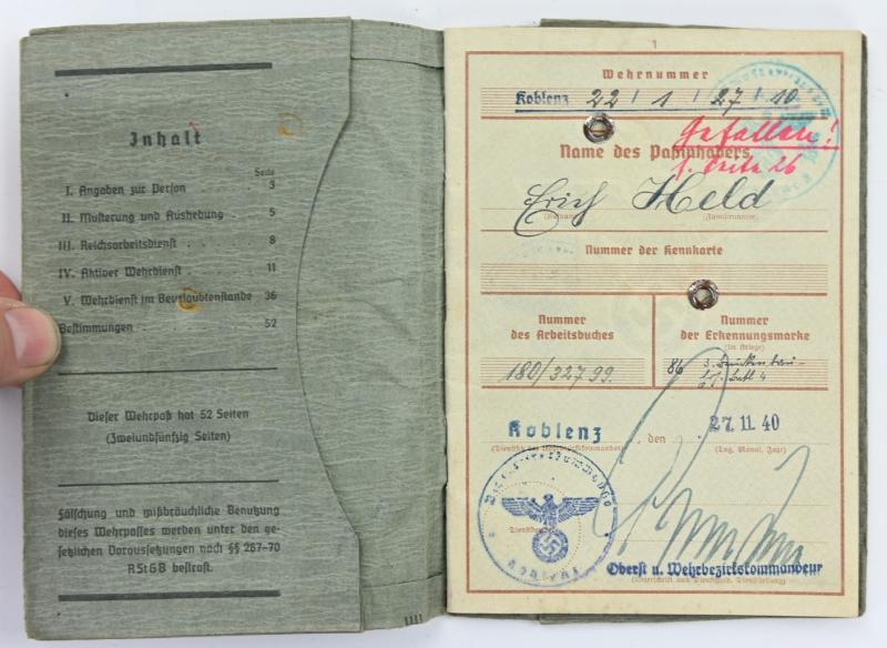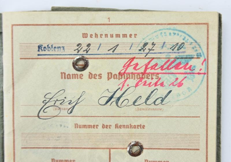 In a very nice condition a German Wehrmacht (Heer) Wehrpass on the name of a member of the Pioneer Battalion 48. Gefreiter Held was killed by grenade schrapnel on 13 October 1942 on the russian front.