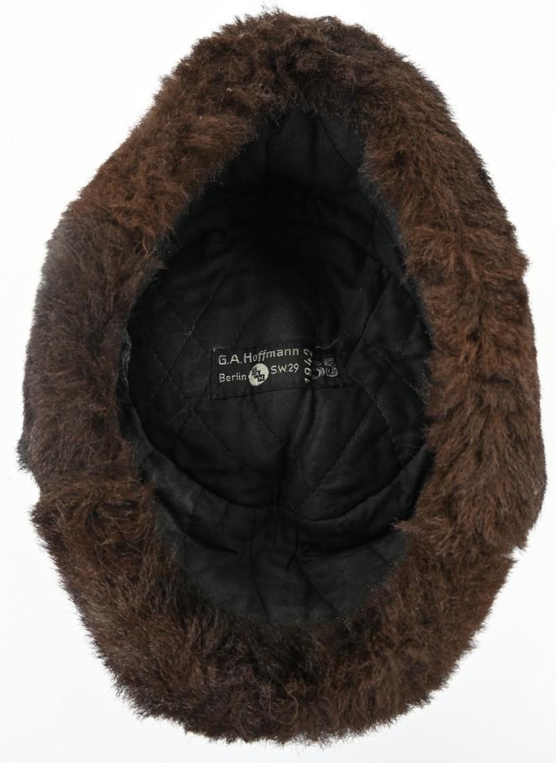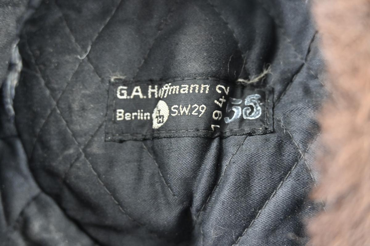 This piece is in very good condition with original insignia. Inside with signs of usage. Manufacturer label G. A. Hoffmann, Berlin, 1942 and size 55. The brown leather is still nice and soft.
