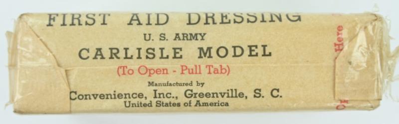 In a very good condition a US WW2 Medical First Aid Dressing Large Model. The early model comes with the name of the maker marked on the side and has the original content still inside!