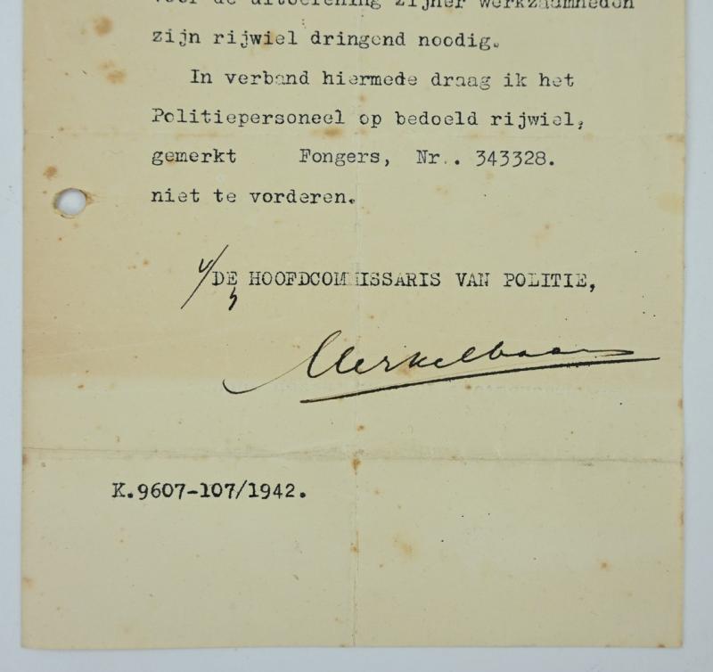 In a nice used condition a Dutch WW2 Permit Paper for bicycle use issued by the Police leader of The Haque in 1942.