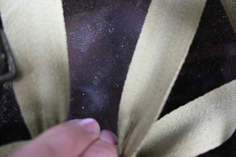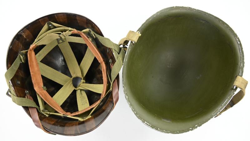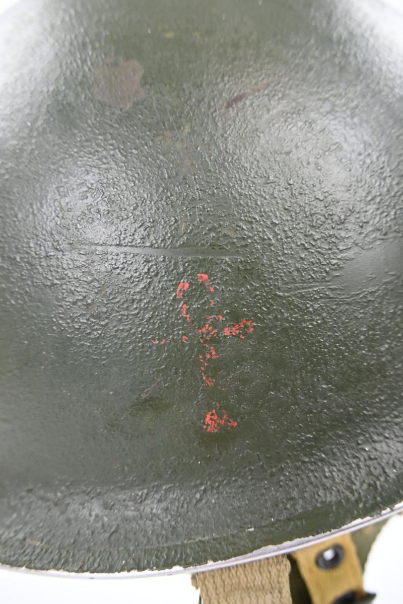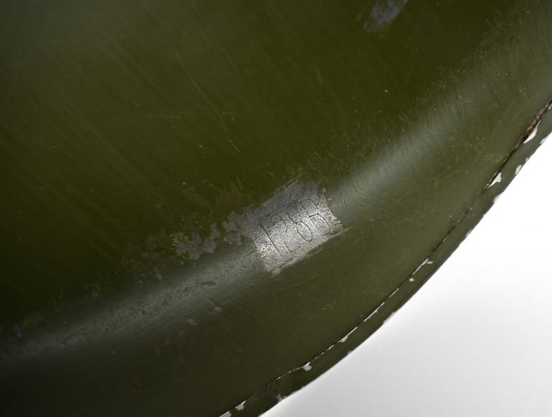 The helmet liner has the laundrynumber on the inside webbing stamped and is completed with a wartime issued 5 zinc eyelet canvas chincup.