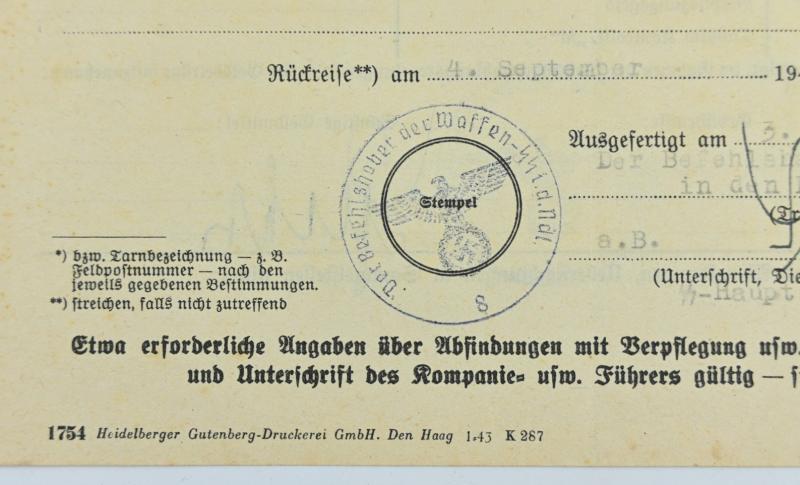 In a very good condition a stunning and hard to find Dutch Waffen-SS Headquarters 'Der Befehlshaber der Waffen-SS in den Niederlanden ' Special Travelcard on the name of SS-Sturmmann Geiger von SS Unteroffizier Schule Arnheim.