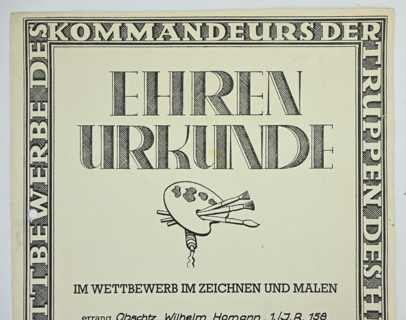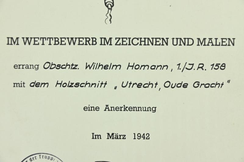 The certificate is on the name of Oberschütze Wilhelm Homann member of the 1.Kompanie/ Infantrie Regiment 158 and was awarded in Utrecht Holland.