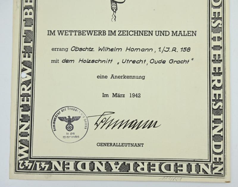 In a very good condition a stunning German Certiicate/ Honor Award of the Wehrmacht Command in Holland (Kommandeurs der Truppen des heeres in den Niederlanden 1941/1942.