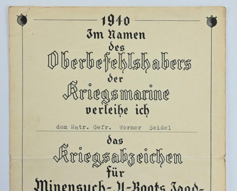 In a very nice condition a German Kriegsmarine Mine Sweep (Urkunde Kriegsabzeichen für Minensuch-U-Boots-Jagd und Sicherungsverbände) certificate.