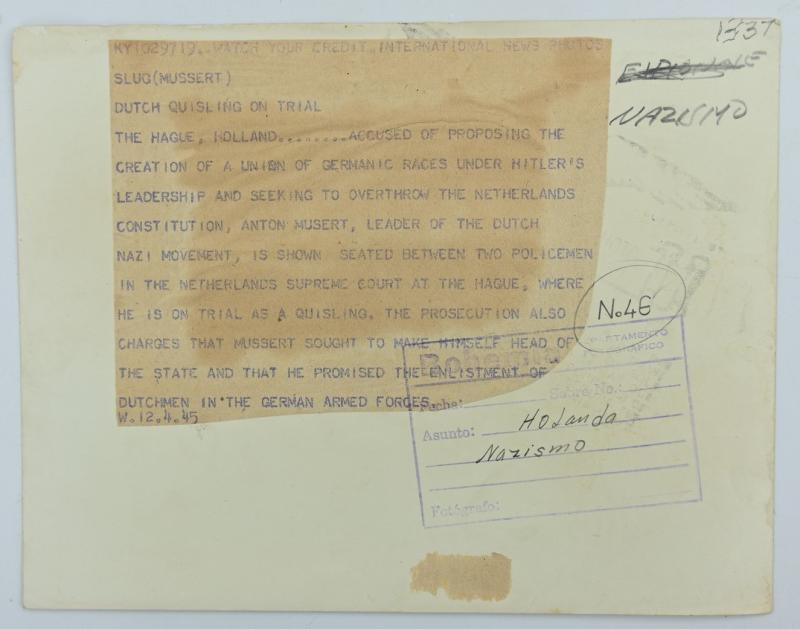 In a nice condition a Dutch Press Photo 'NSB Leader Mussert on Trail'. The picture is taken on april 1945 and comes in a size of 13x18cm.