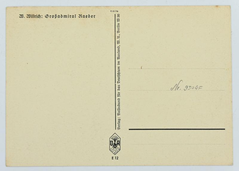 In a very good condition a German Kriegsmarine Postcard of Kriegsmarine 'Grossadmiral Reader'. The postcard comes from the Willrich Serie.