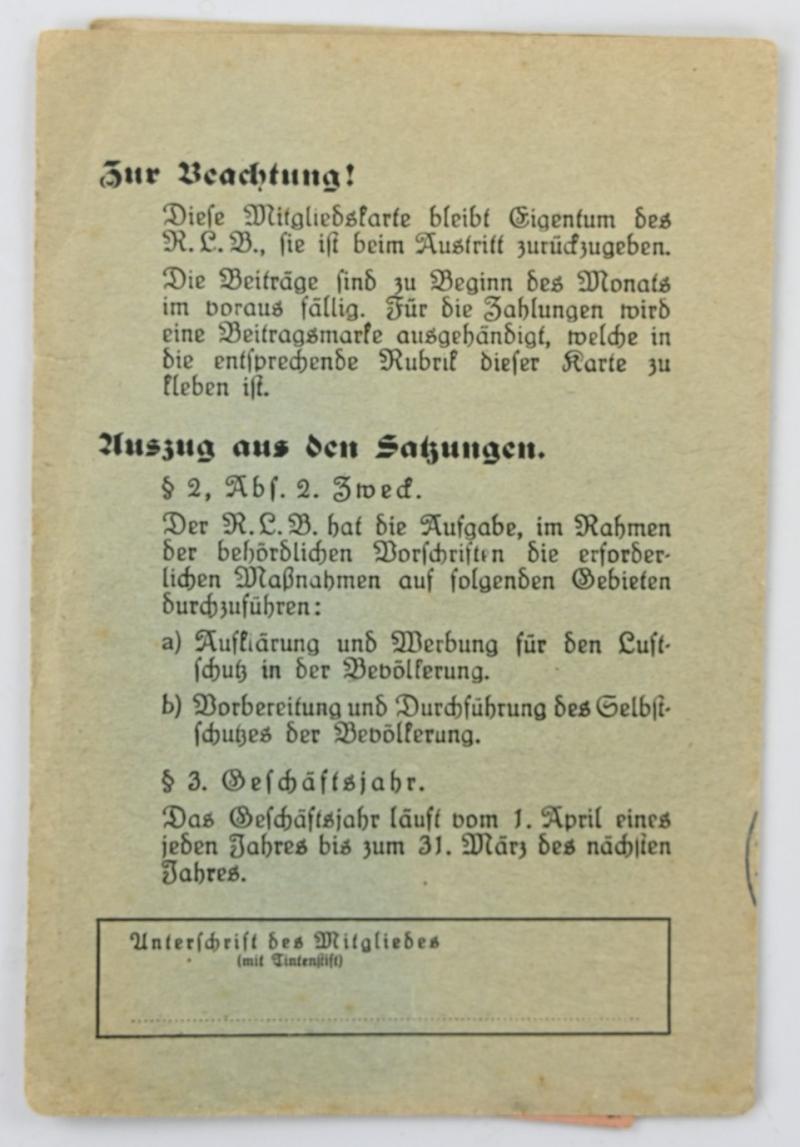In a very good condition a German Reichsluftschutzbund member card (Mitglieds-Karte). The card is named and dated 1936.