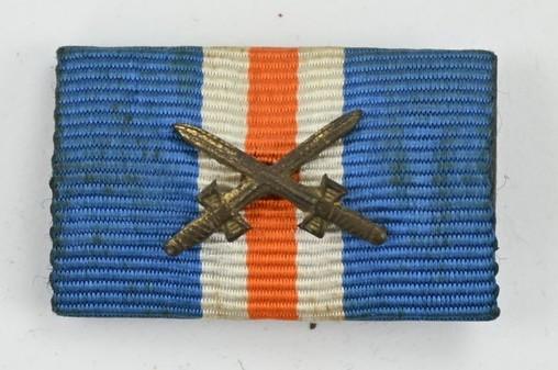 The Mussert Cross was instituted as a decoration to be awarded to NSB members in German service who had taken part in the campaign against Russia. The medals are never officially awarded because they were not approved by the German command. On front the Swastika and Wolfshook are shown, the back carries the text 'Hou en Trou' and 'Mussert 1941'. The medal is in good condition and complete with its original confectioned ribbon and matching batton, the set comes in its original, regrettably damaged carton box. The box is showing some damage like mostly when found.