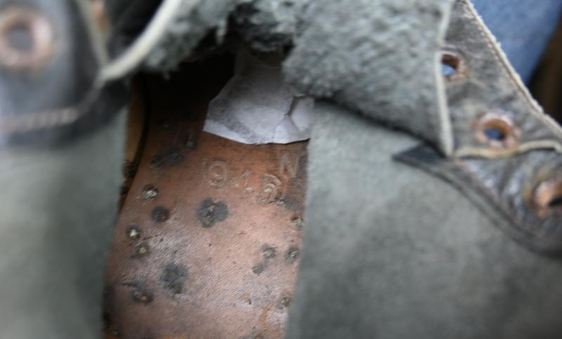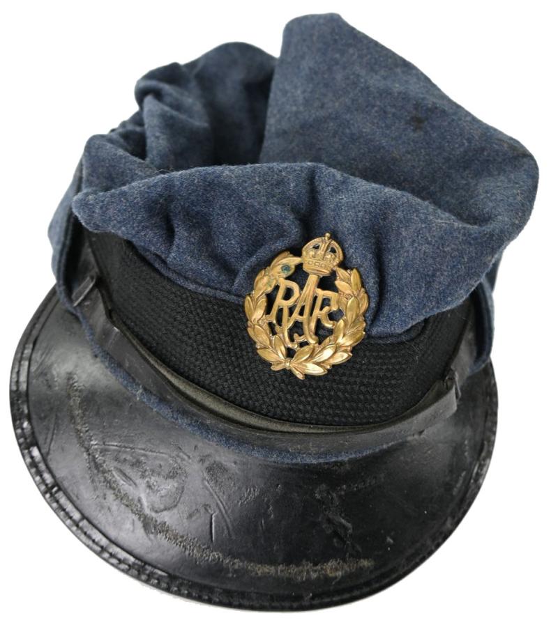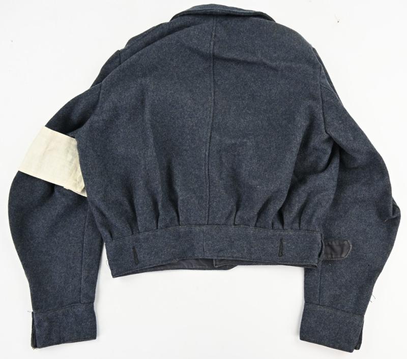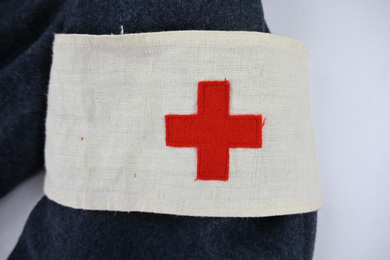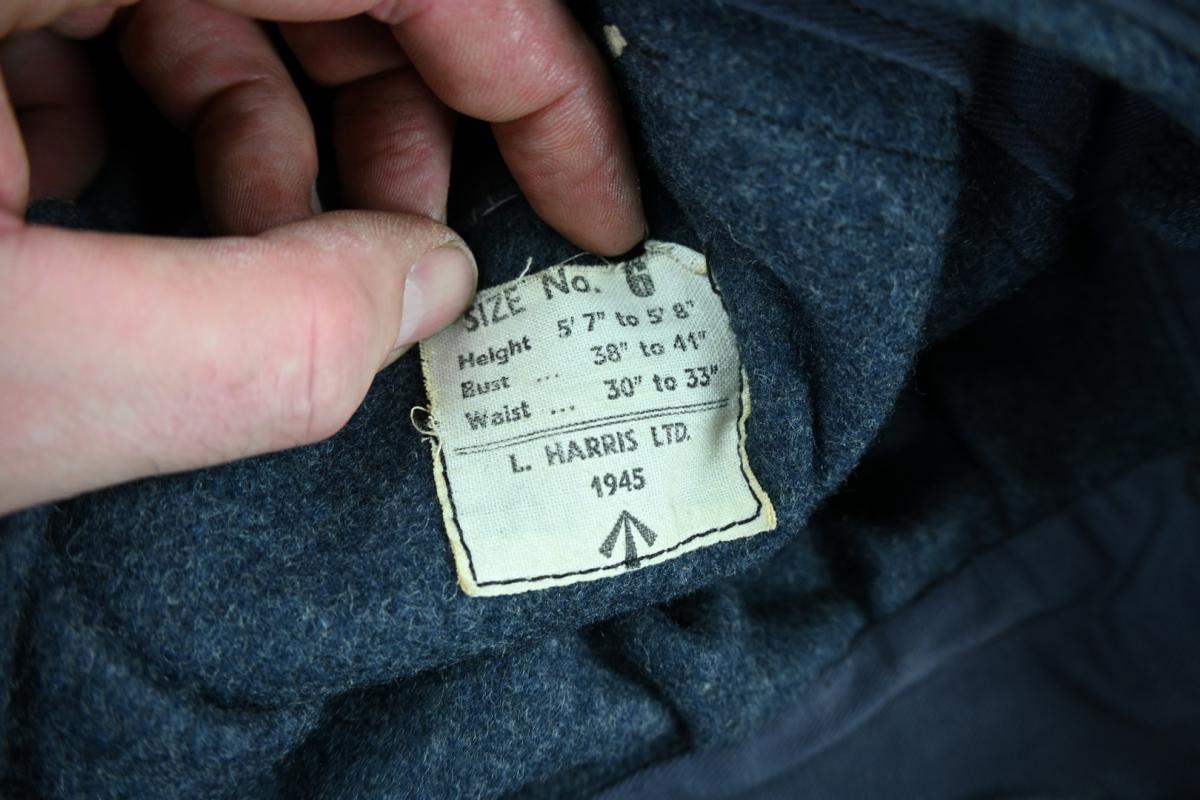 The grouping contains the cap with badge dated 1942 and comes in size 7,5''. A stunning brody helmet in the original RAF blue paint, a pair of 1945 dated small size boots, battledress size 6 dated 1945 with red cross armband and a pair of battledress trousers in size 2 and dated 1944.