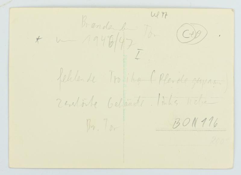 In a very good condition a postwar postcard of the Brandenburger Tor. The postcard comes with the ruines of the war clearly visible. Postcard is dated 1946 or 1947.