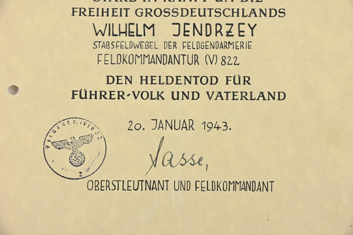 In a very good condition a hard to find certificate of teh death of Stabsfeldwebel der Feldgendarmerie Wlhelm Jendrzey member of feldkommandatur (V) 822.