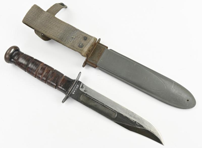 In a very good condition a US Navy WW2 Ka-Bar Fighting Knife. The knife is nicely KABAR marked and comes with the original scabbard. Sadly the snap button is broken.