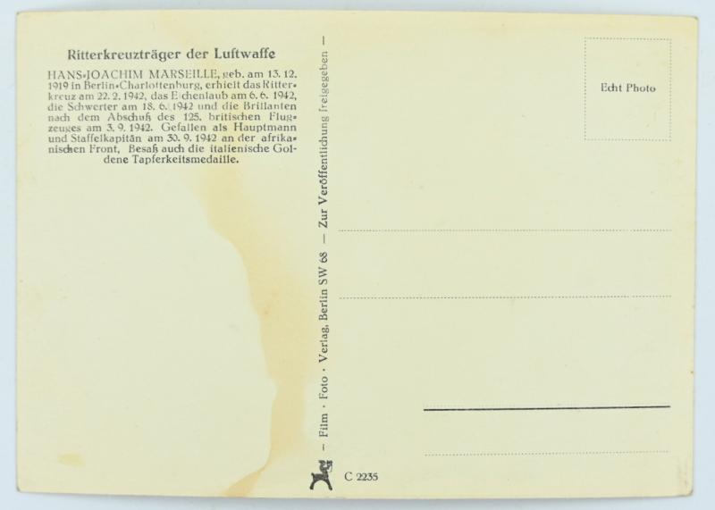 In a very nice condition a German Luftwaffe Portrait Picture of Hauptmann ''Hans-Joachim Marseille'. The portrait picture comes in a postcard size.