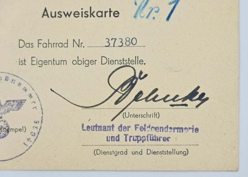 In a very nice condition a German Wehrmacht Feldgendarmerie ID Card. The card reads that the bicycle that is used is owned by the Feldgendarmerie-Trupp 451 accourding the feldpostnumber.