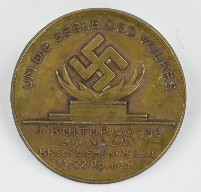 In a very good condition an rare ealry NSDAP Kreis Liebenwerda badge of 1934. 1st culture week of the NSDAP on April 14-22 1934. The badge comes with a functional needle and catch.