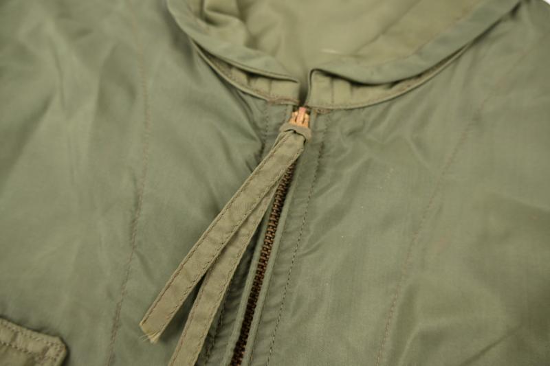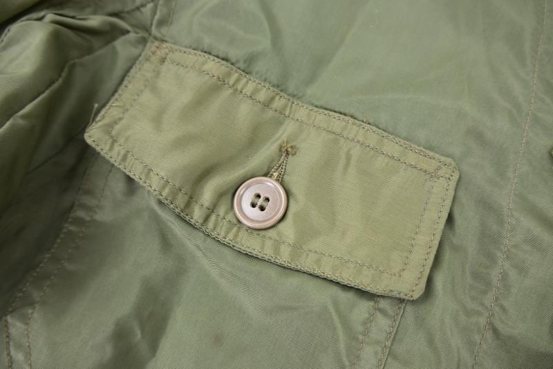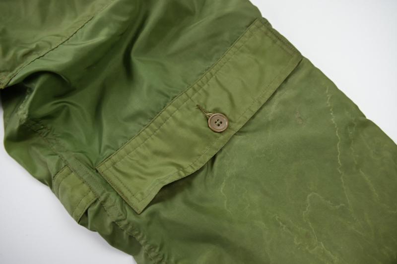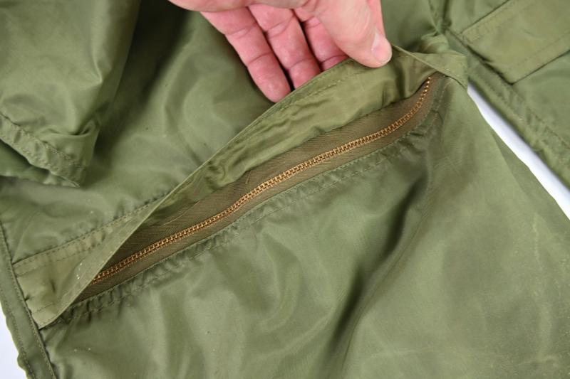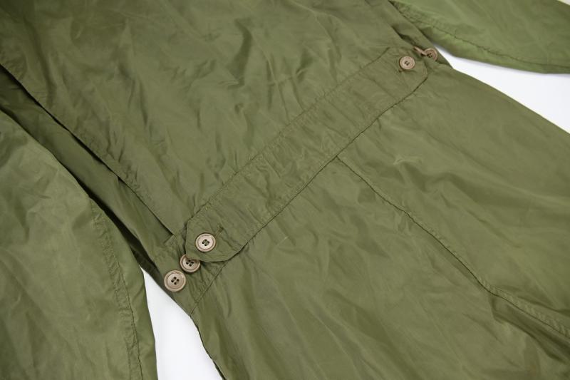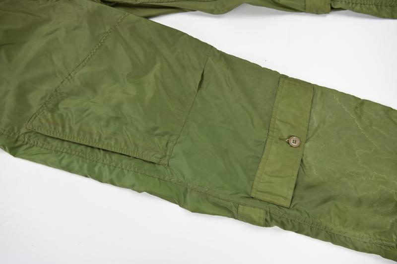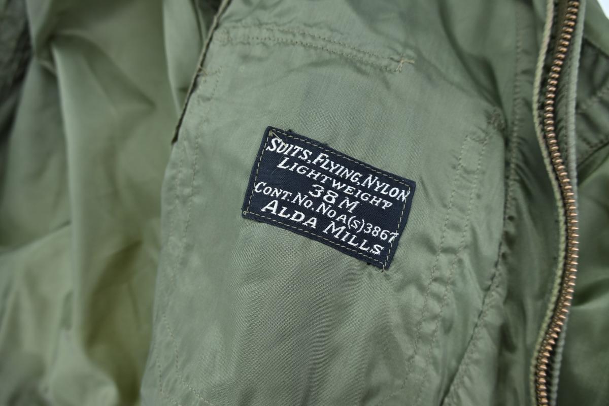 In a mint condition a stunning US Navy pilot lightweight flying suit. Unlined nylon. Size 38L. Made by ALDA MILLS. WWII contract. Two flap closing pockets on lower front legs area. 4 zipper closing pockets on side and rear legs area. One main zipper. All working, made by TALON. Waist pulling straps. Very rare and great item for a late WWII US Navy or USMC pacific theater Corsair, Avenger or hellcat pilot impression.