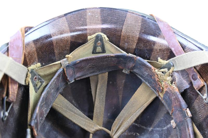 Inside the helmet shell is a stunning Westinghouse paratrooper liner present with both A-Yokes original attached and with complete used webbing.