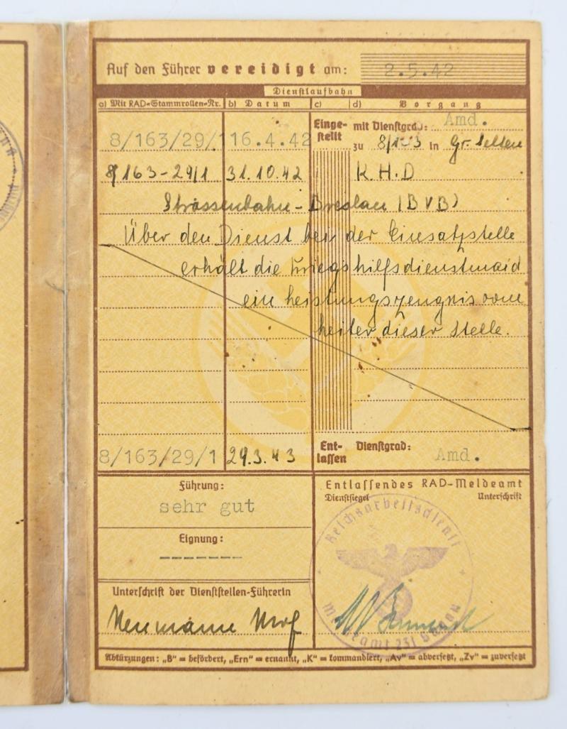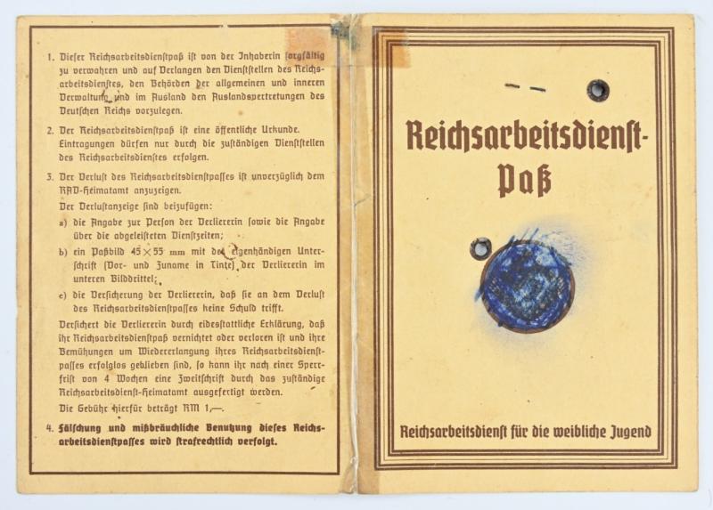 In a very nice condition a German Reichsarbeitsdienst Good Conduct Certificate and pass on the name of Marianne Weinhold.