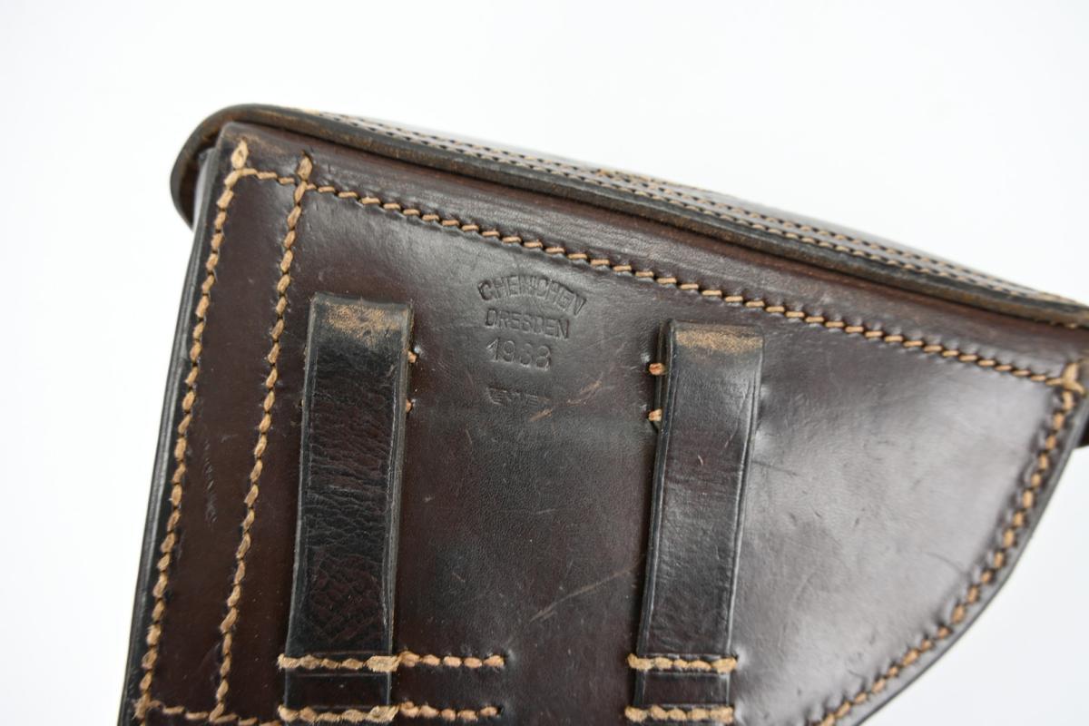 The brown leather holster comes in a complete condition and is WaA stamped and maker marked on the reverse side and dated 1938.