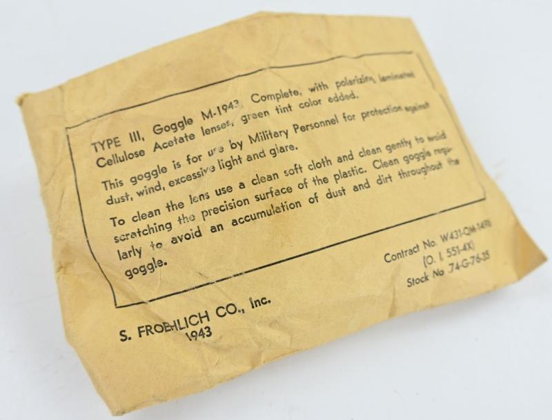 In a very good condition a US WW2 Dust Goggles in original paper pouch. The pouch is nicely dated 1943 and is made by S. Froelich Co. A very nice complete and never used set!
