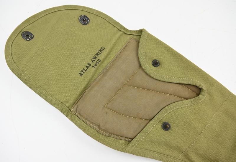 These scabbards were mostly used by US Airborne troops. Nicely maker marked by Atlas Awning Inc. and dated 1943.