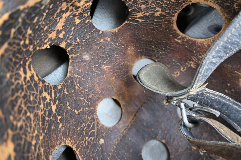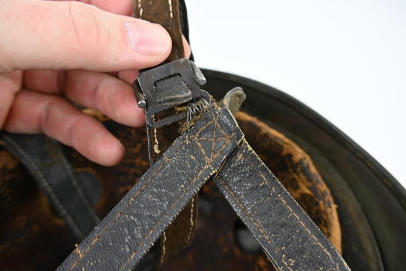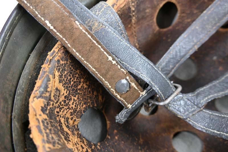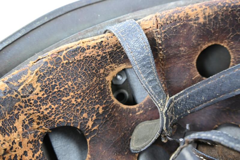 The helmet comes with the lining intact, padding, leatherwork and chinstraps. One chinstrap is replaced and has a repaired catch.