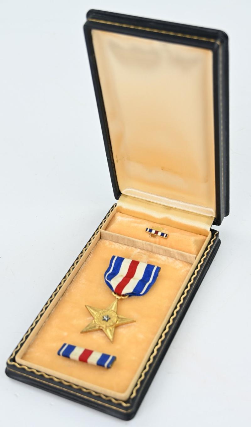 In a very good condition an US WW2 Silver Star medal set in Case. The set contains the medal, ribbonbar and also the buttonhole batton. A very nice set!
