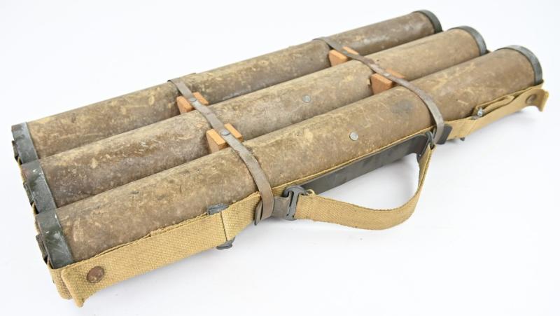 The Cardboard Tube carrier was intended to hold three 2 inch mortar rounds. The carrier comes with the paper label tag still attached.