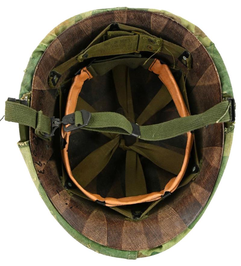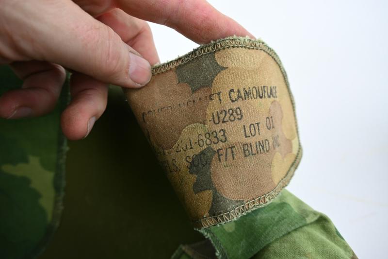 The helmet has on the outside the Mitchell camouflage cover original attached and the attached helmet band arround the helmet and US marked.