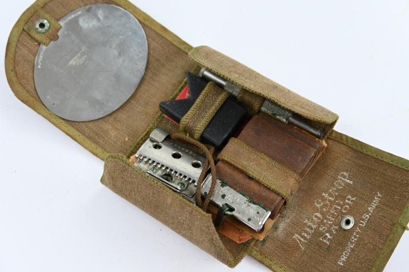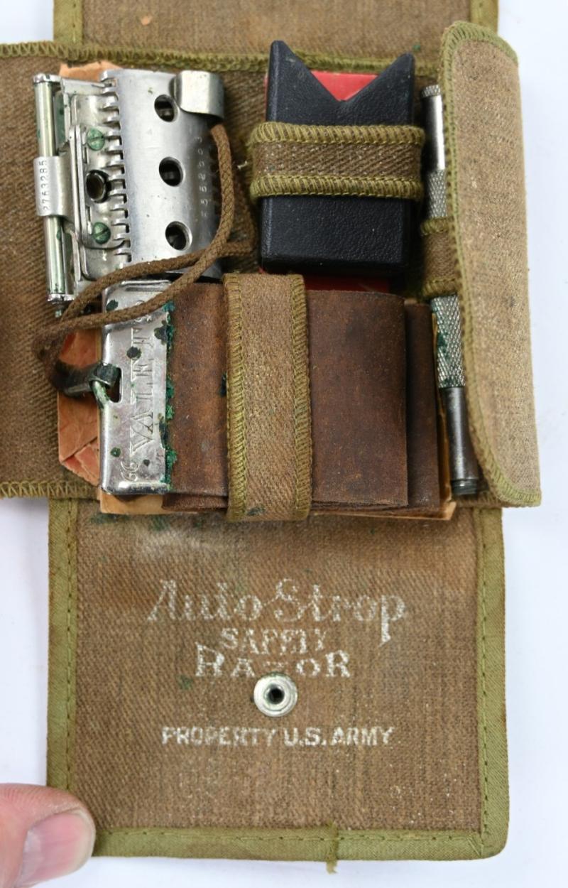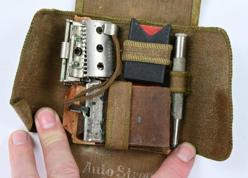 In a very nice condition a US WW2 Razor Set in Pouch. The set and pouch are maker marked by Autostrop Safety Razor. A very nice set for display!
