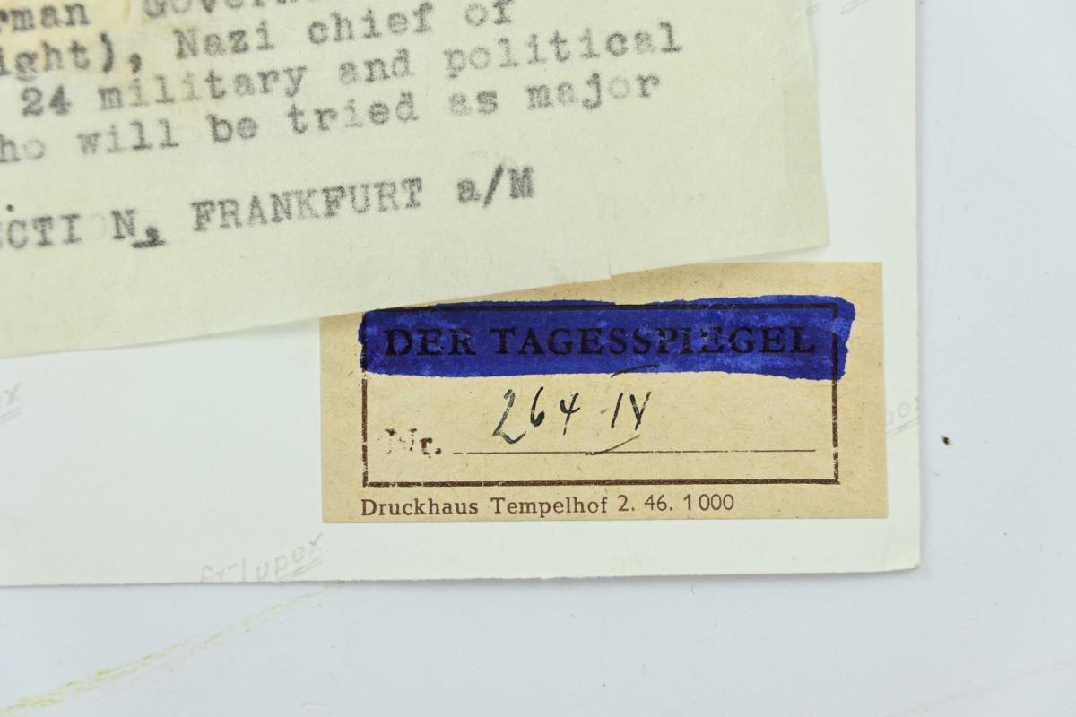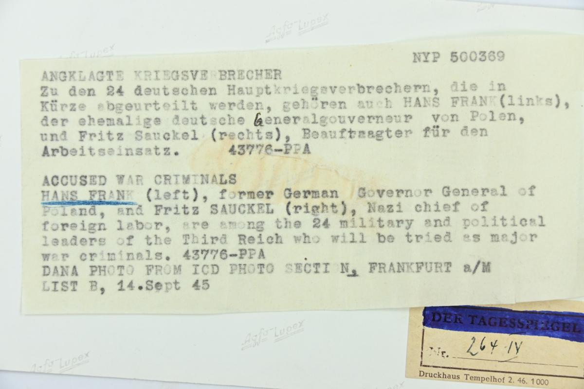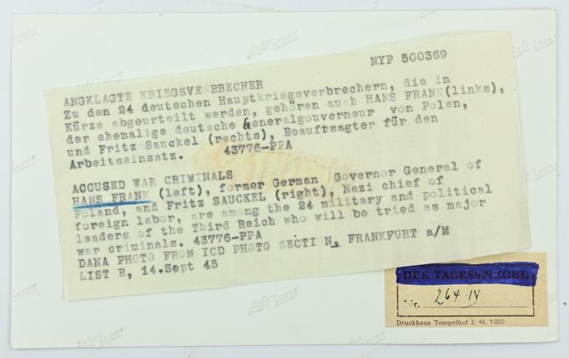 In a very nice condition an Allied Press 'Mug-Shot' Picture of Nuremberg Trail Members Hans Frank (General Governer of Poland) and Fritz Sauckel (Nazi general plenipotentiary for labour deployment).