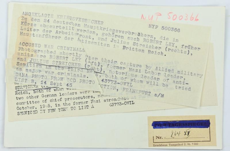 In a very nice condition an Allied Press 'Mug-Shot' Picture of Nuremberg Trail Members Robert Ley former nazi labor leader and Julius Streicher (Nazi Party leader and founder of Der Stuermer).