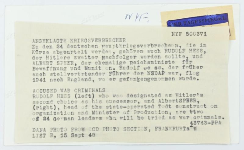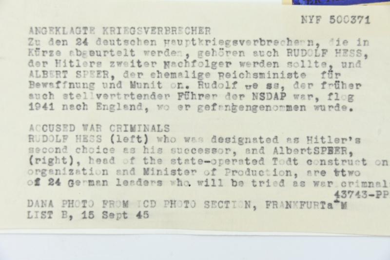 In a very nice condition an Allied Press 'Mug-Shot' Picture of Nuremberg Trail Members Rudolf Hess (former nazi leader) and Rudolf Hess (Reichsminister).