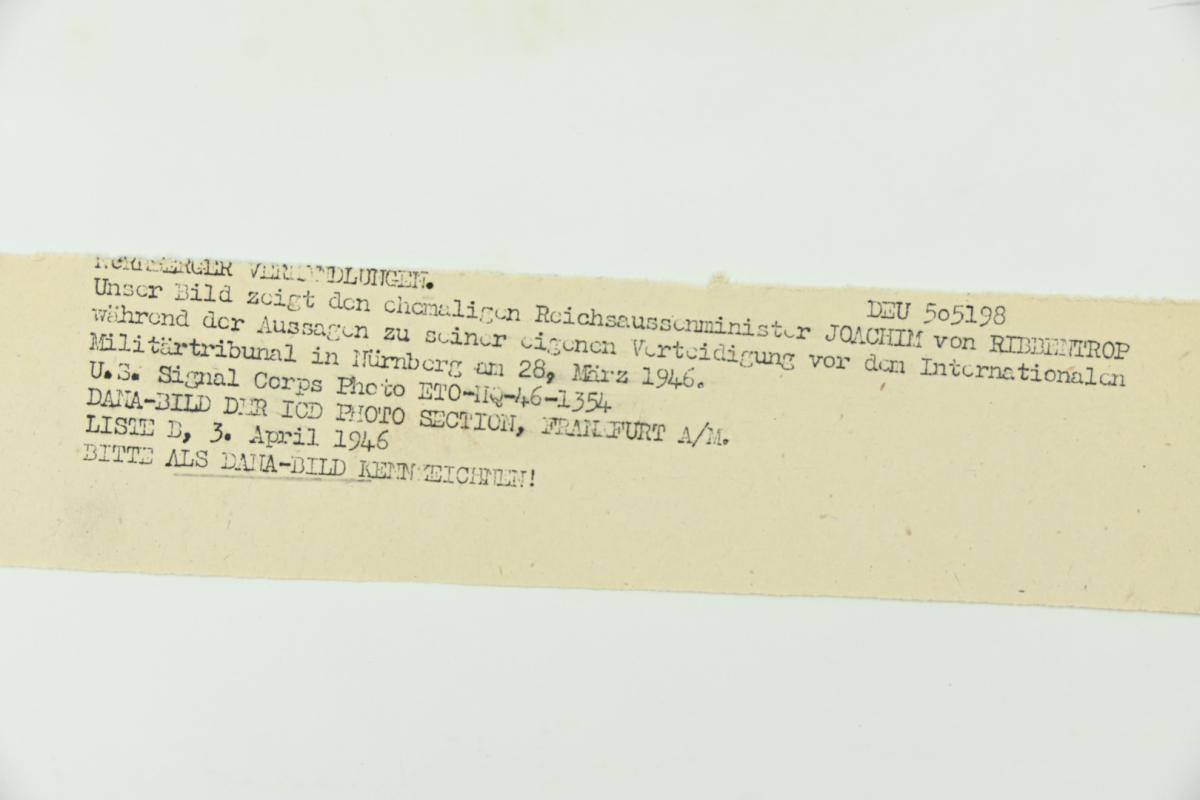 In a stunning condition an Allied Nuremberg War Trails Picture of Joachim von Ribbentrop German politician, diplomat, and war criminal who served as Minister of Foreign Affairs of Nazi Germany from 1938 to 1945.
