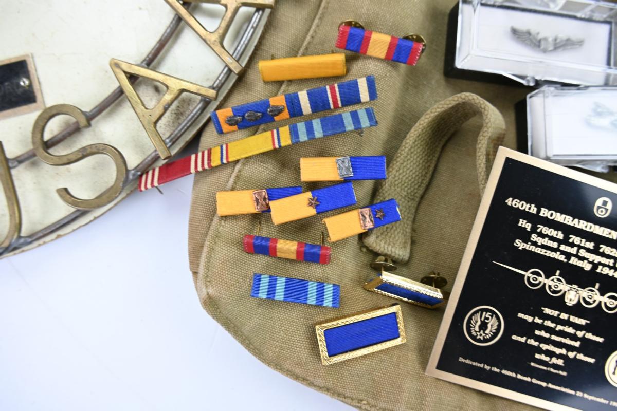 Also his wartime musset bag, dogtags, pilot wings (included bouillon wings) 50 missions certificate, medals (postwar issued) large