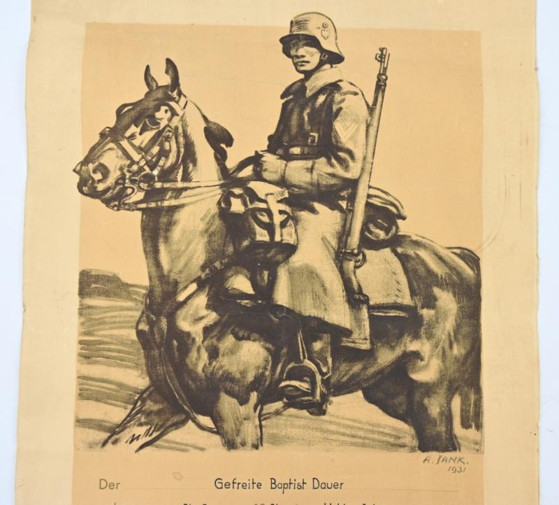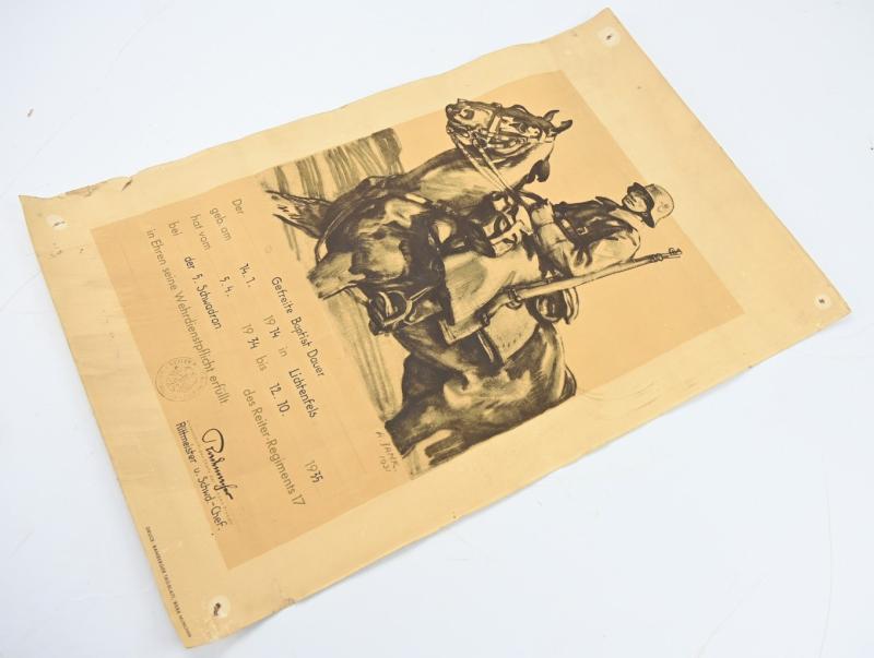 In a very nice condition a stunning German Reichswehr Cavalry Certificate of 1935. The certificate comes in a poster size of approx 40x60cm.