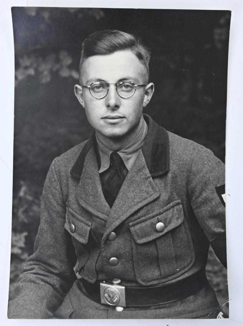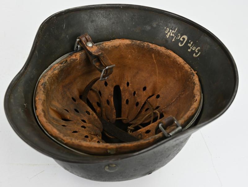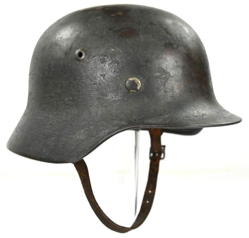 His helmet is a very stunning Wehrmacht M35 Reissued Single Decal Combat Helmet with the original (shortened) chinstrap still present attached to the original placed helmet liner.