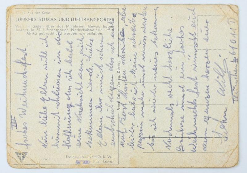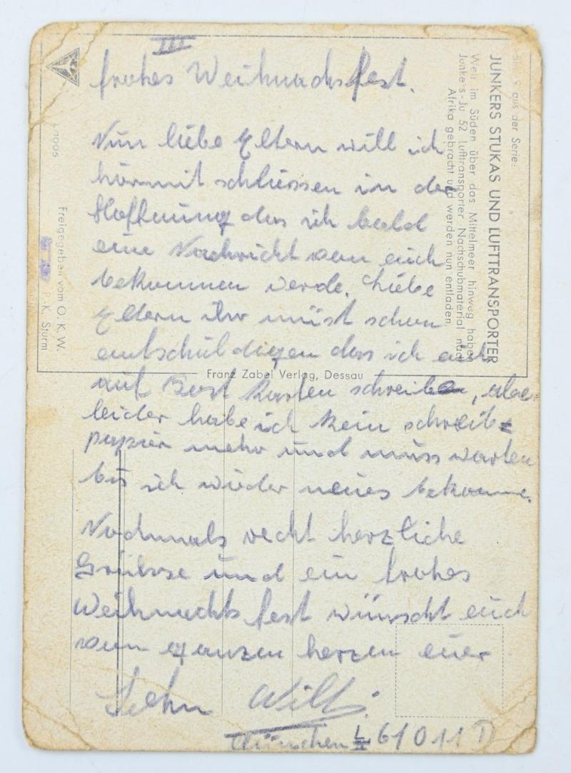 The postcard is written as fieldpost by a member of the Stab III u. 9.-12. Kompanie Fallschirmjager-Regiment 1 accouring the fieldpostnumber on the bottom of the message.