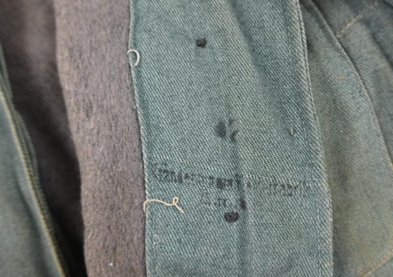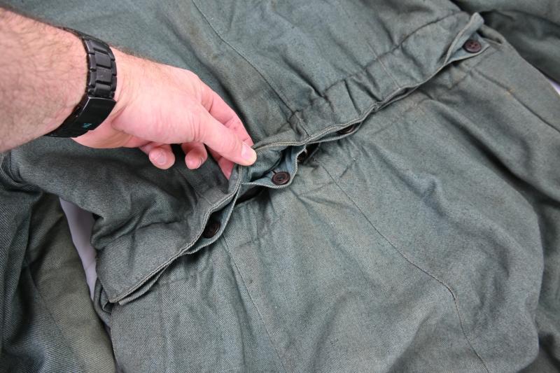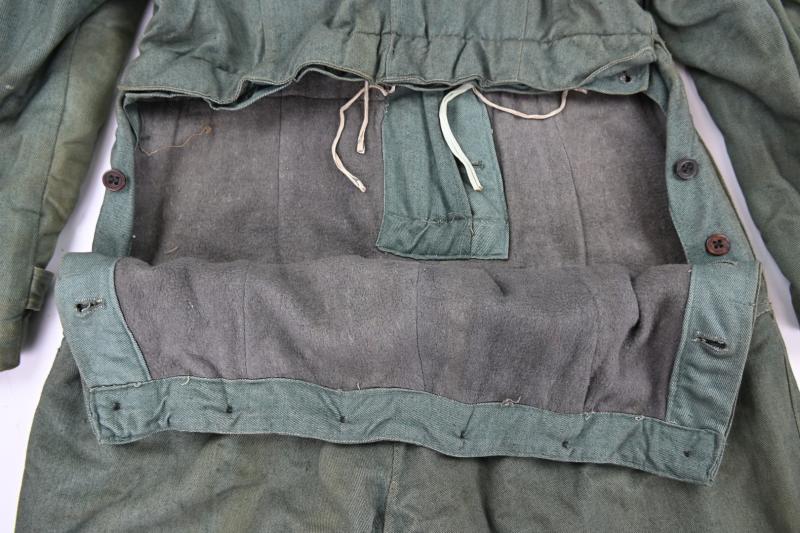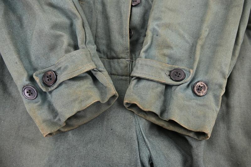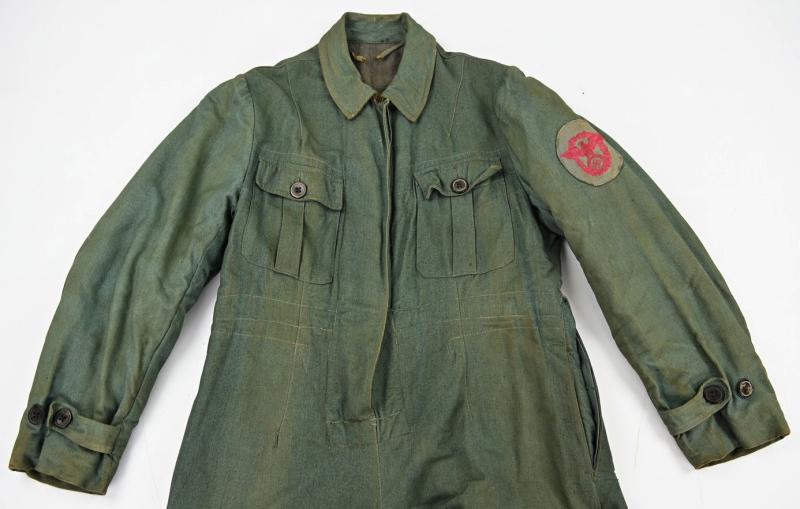 The coverall comes with all original applied wooden buttons and has on the sleeve the original sewed eagle of the Fire Police present.