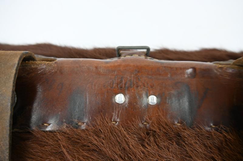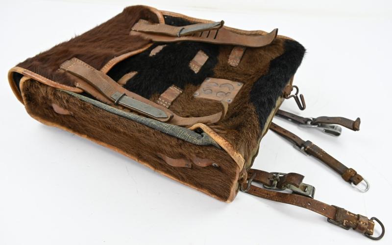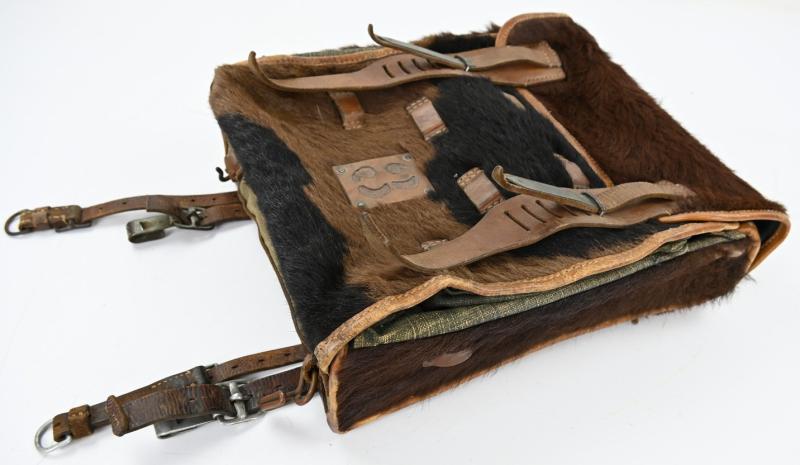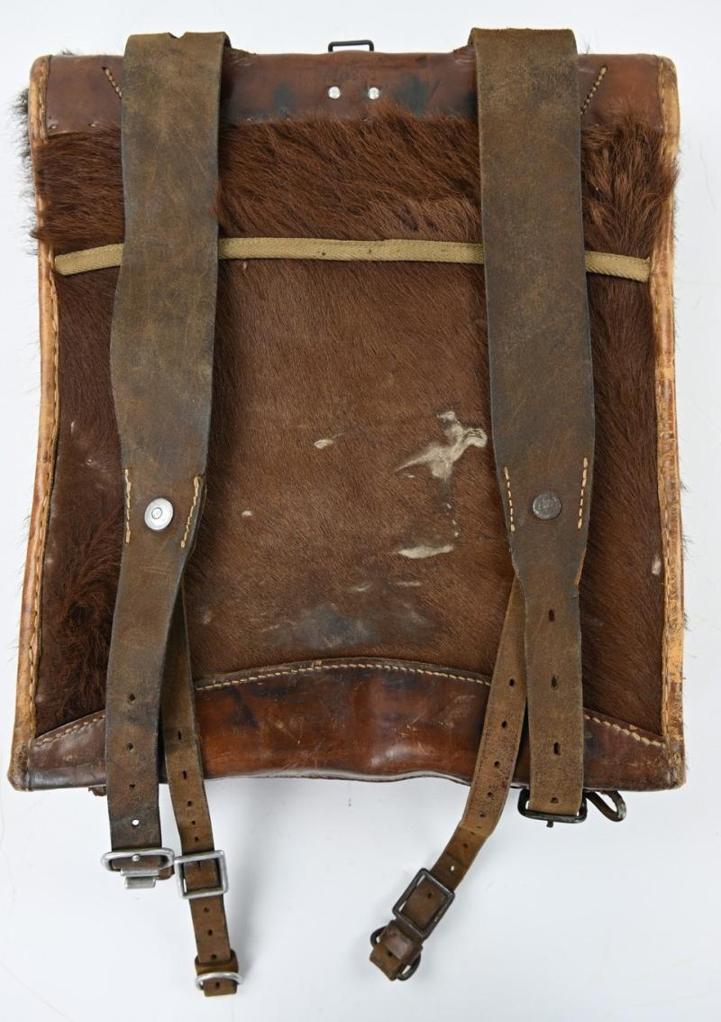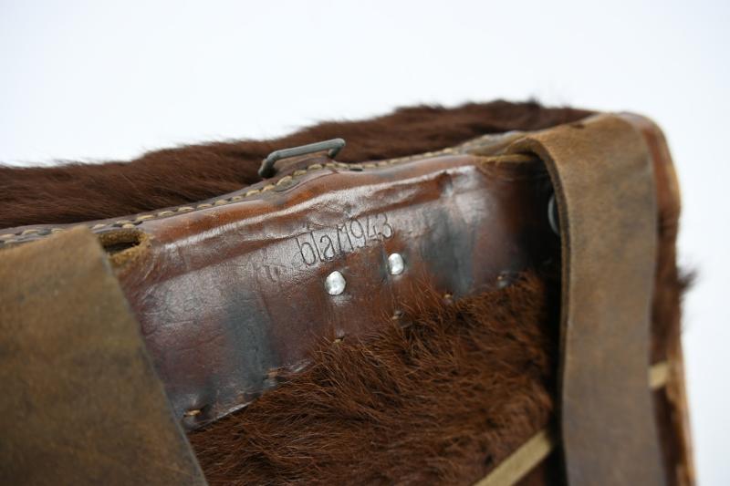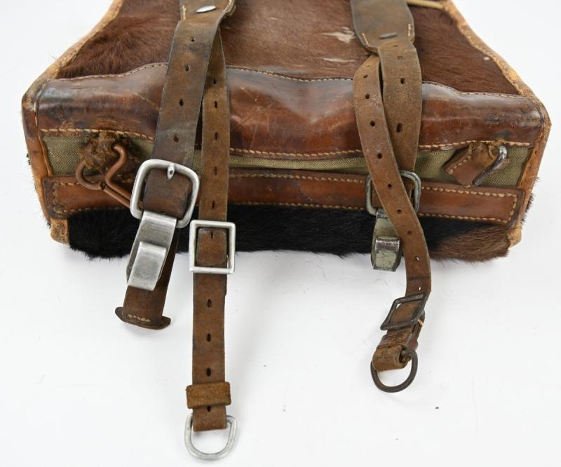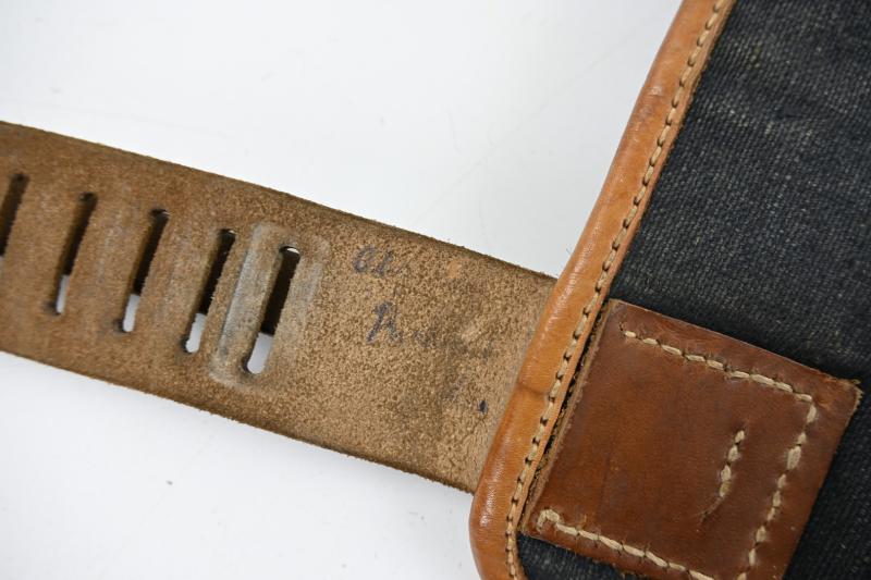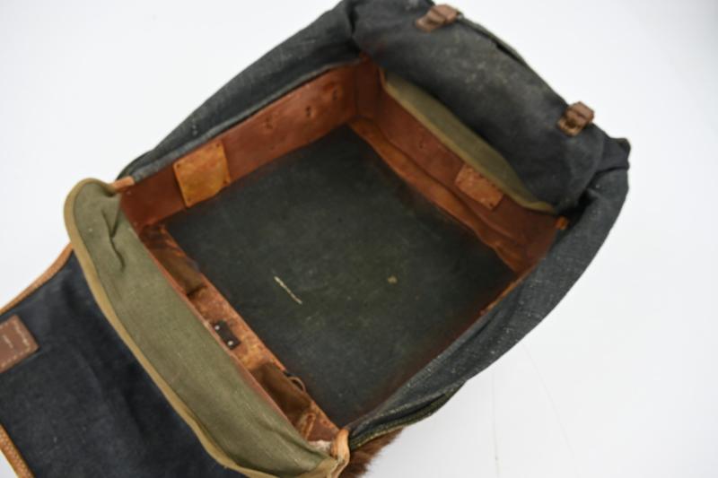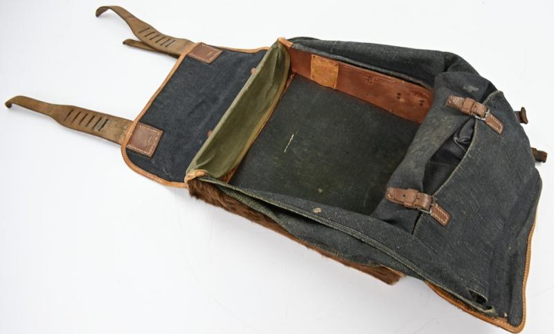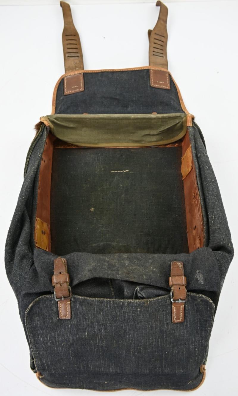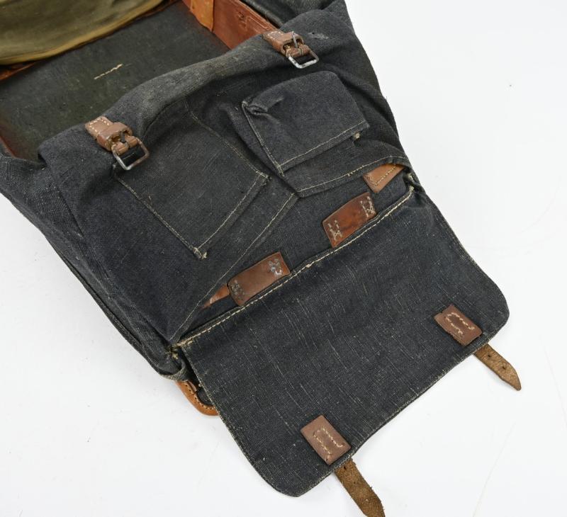 The tornister comes in the harder to find blue coloured fabric and has the cloth pouches and leather straps present. Sadly is the aluminium deviders missing inside the tornister.