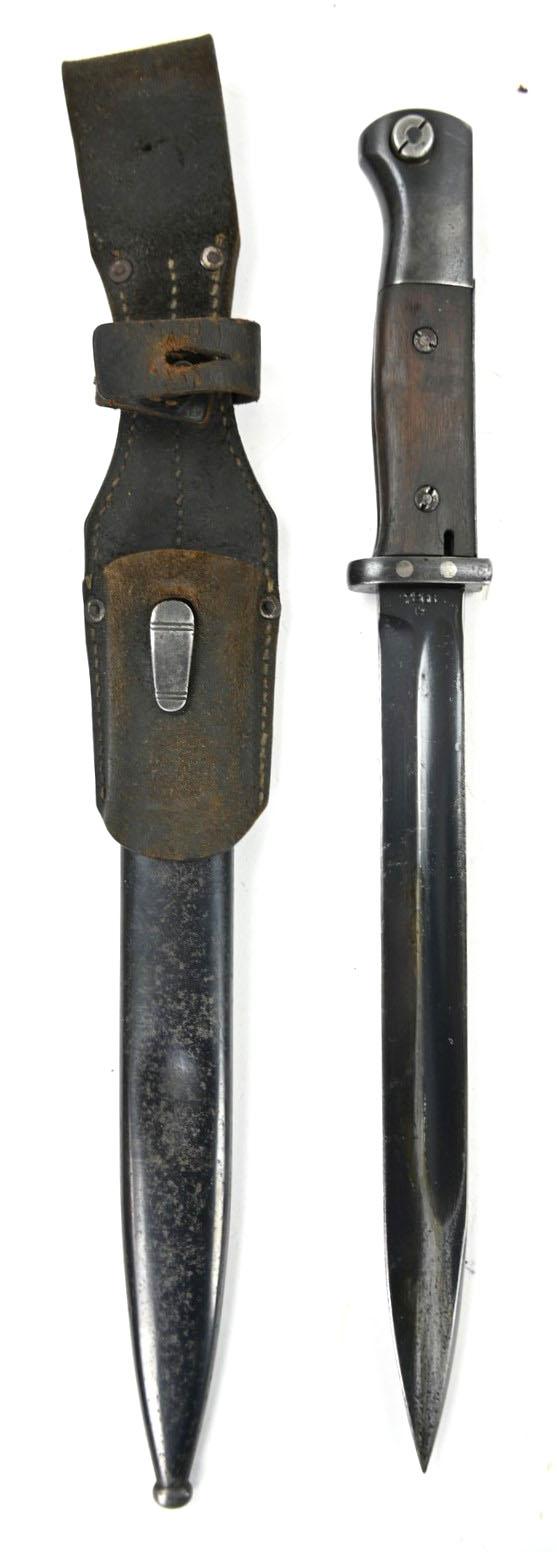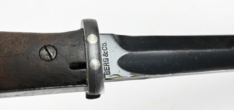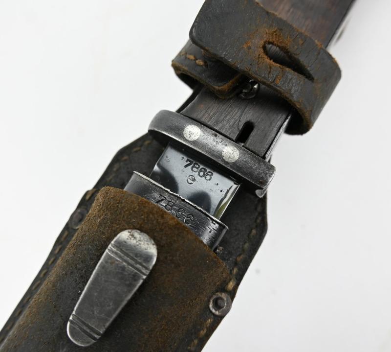 The bayonet and scabbard are number matching 7866e and maker marked by Berg & Co. from Solingen and is dated 1937.