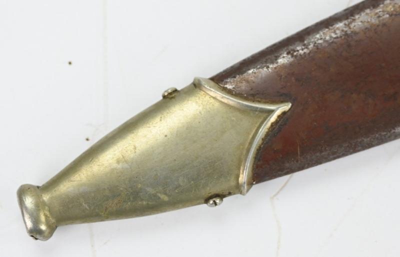 The scabbard comes in a matching condition with the rest of the dagger. The brown painted scabbard body shows only light scratches one light dent, and has managed to retain almost all of the original paint and comes with traces of aging.