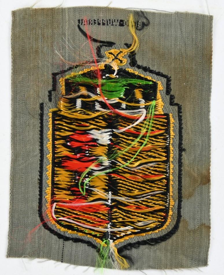 The shield is executed in the neat so-called BeVo weave style on a field-grey linnen background. The shield is in good mint and unissued condition showing only some minor staining caused by years of storage. Nice original Eastern Volunteer Sleeve Shield!
